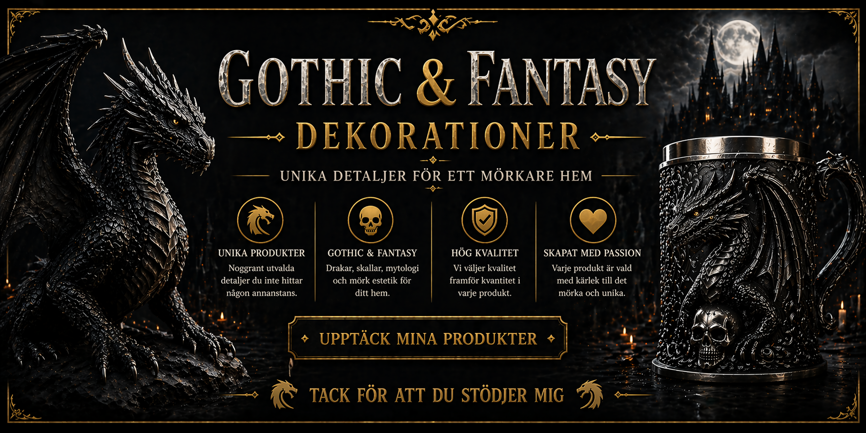Här hittar du gothic-inspirerade dekorationer med mörk elegans och ett uttryck som sticker ut. Från detaljerade dödskallar och majestätiska drakar till eteriska féer – produkter som fångar blicken och skapar en atmosfär av något bortom det vanliga.