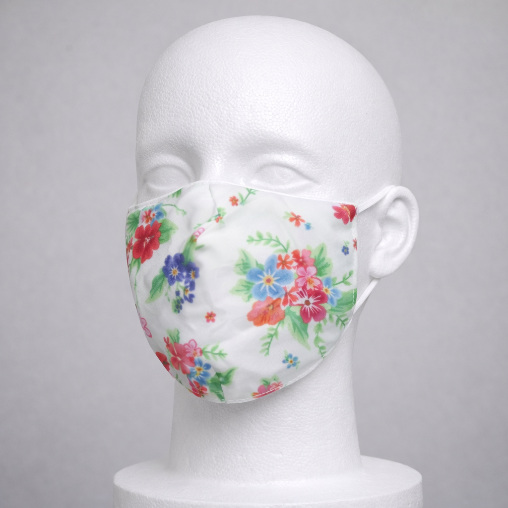 Ljus ansiktsmask i vit design med färgstarkt blommönster i rosa, blå, röda och gröna toner. Den mjuka och somriga designen ger ett stilrent men samtidigt livfullt uttryck som passar bra i vardagen.