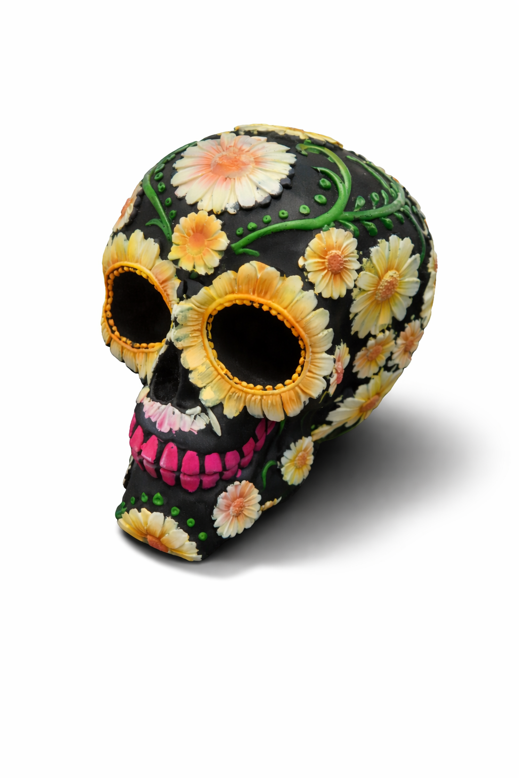 Dekorativ dödskalle i resin med ett färgstarkt blommönster inspirerat av klassisk Day of the Dead-design. Den svarta basen lyfts av detaljerade blommor i varma toner samt gröna slingrande mönster som ger ett livfullt och unikt uttryck.