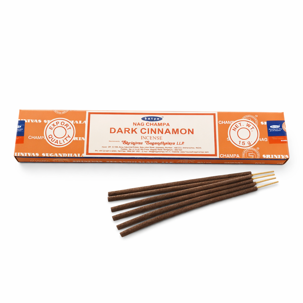 Satya Nag Champa Dark Cinnamon är rökelse med varm, kryddig doft av kanel. Passar för att skapa en lugn och behaglig atmosfär i hemmet, vid meditation eller avslappning.