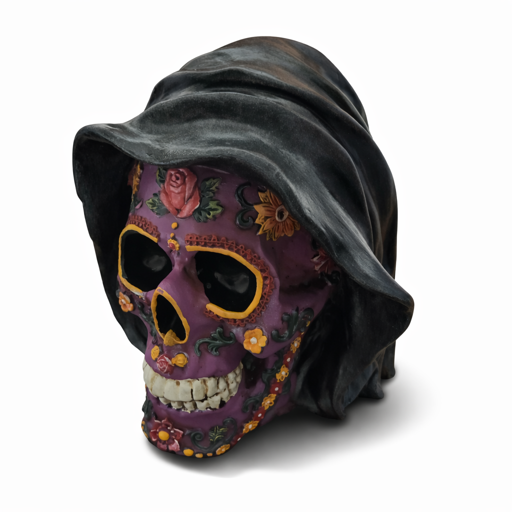 Skallen har en djup lila färg med detaljer i blommotiv och ornament, kombinerat med en mörk kåpa som ger ett mystiskt och kraftfullt uttryck.
