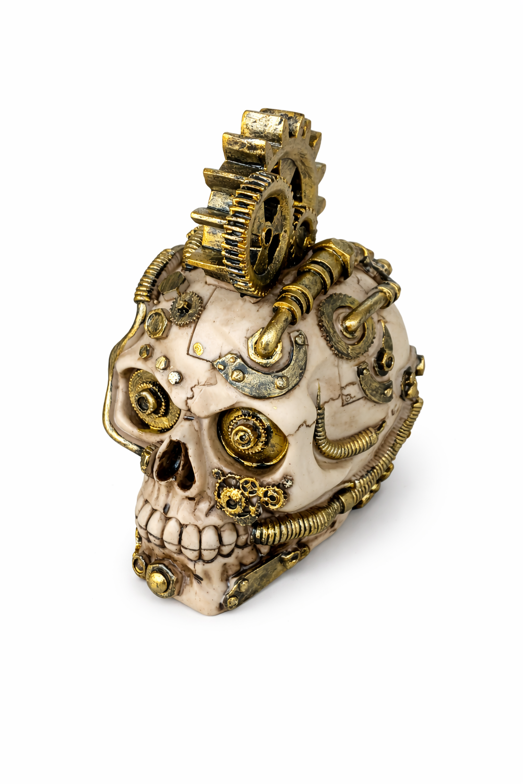detaljrik och iögonfallande dekor figur i form av en dödskalle med steampunk-inspirerade detaljer. Figuren är dekorerad med kugghjul, rör och metalliska inslag som ger ett industriellt och unikt uttryck.