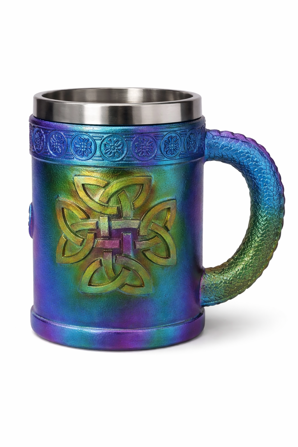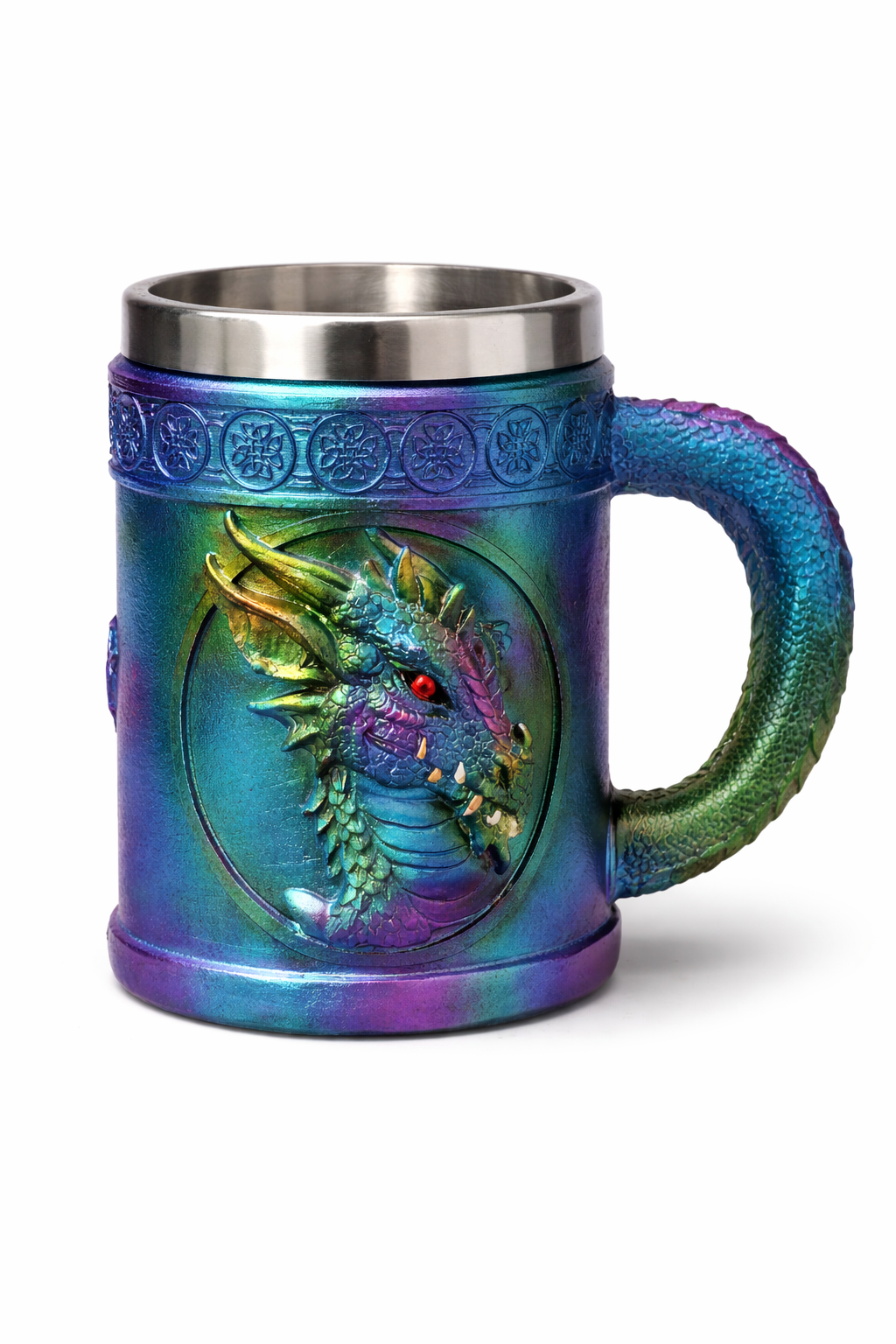 En unik dekorations bägare i resin med metall insida, designad med ett kraftfullt drakmotiv och keltiskt inspirerat mönster. Den iriserande ytan skiftar i färger som blått, grönt och lila beroende på ljuset, vilket ger ett levande och exklusivt uttryck.