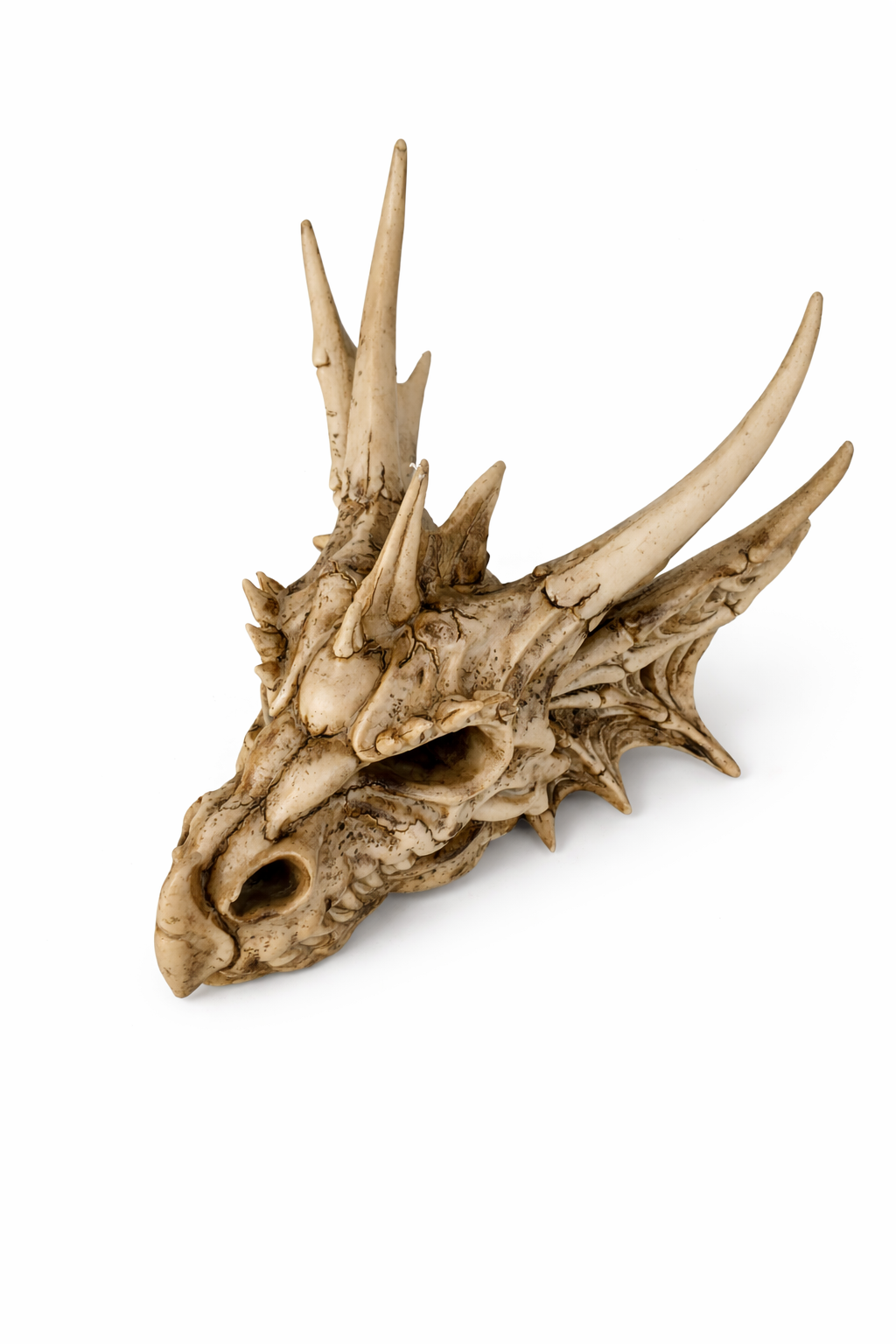 Detaljrik dekorations figur i form av en drakskalle med kraftiga horn och tydliga strukturer. Figuren är tillverkad i resin och har en naturtrogen finish som ger ett rått och dekorativt uttryck.