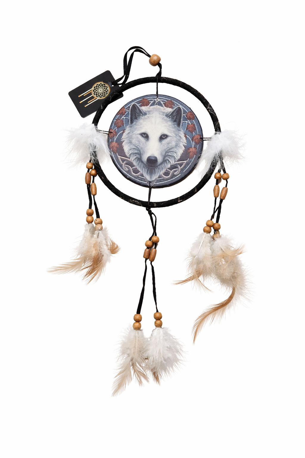 Dekorativ dröm fångare med detaljrikt varg motiv i centrum, omgiven av ett mönstrat cirkulärt ramverk. De hängande banden med fjädrar och pärlor ger ett naturligt och harmoniskt uttryck som passar perfekt som inredningsdetalj i hemmet.