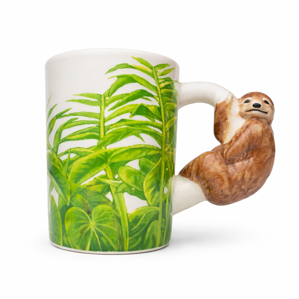 Dekorativ mugg i dolomit keramik med tropiskt blad motiv och handtag formad som en söt sengångare. Rymmer ca 400 ml och passar perfekt för kaffe, te eller varm choklad. Produkten är livsmedels säker.