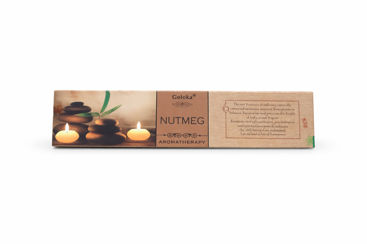 Goloka Nutmeg Aromatherapy är en väldoftande rökelse med en varm och kryddig doft av muskotnöt. Den är framtagen för att skapa en lugn och harmonisk atmosfär i hemmet och passar perfekt vid meditation, avslappning eller när du vill ge rummet en behaglig doft.