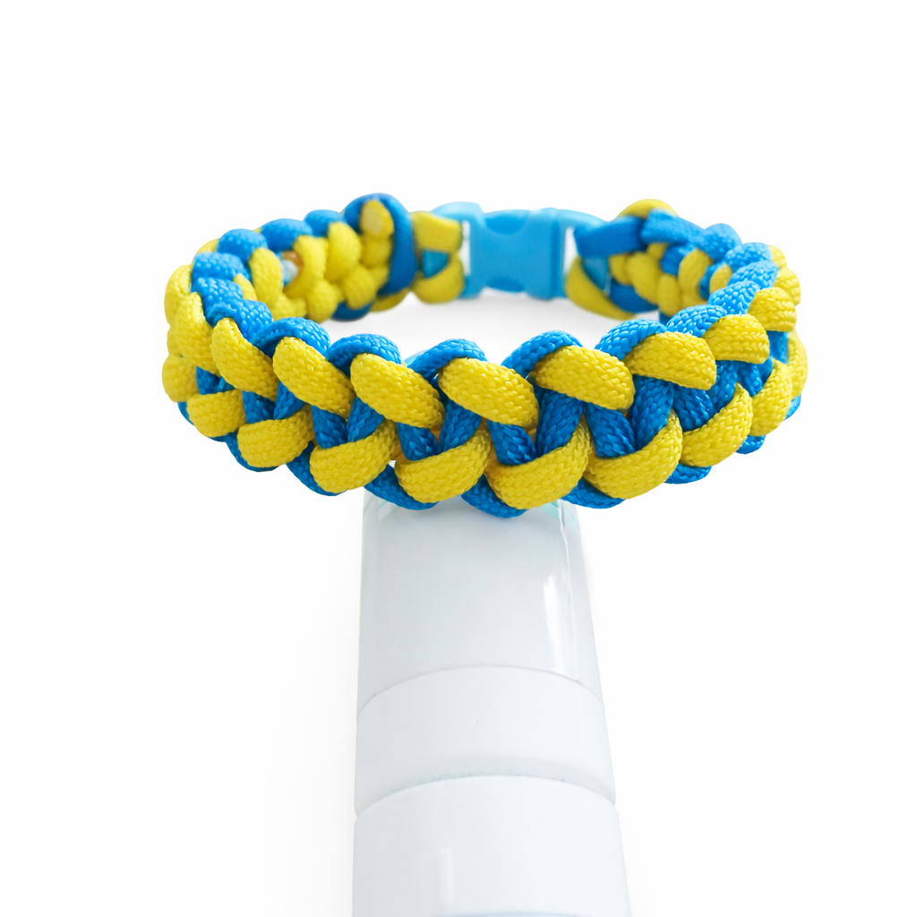 Shark Jaw i en tydlig och stilren färgkombination av blått och gult. Shark Jaw-flätningen ger armbandet ett kraftigt och unikt mönster