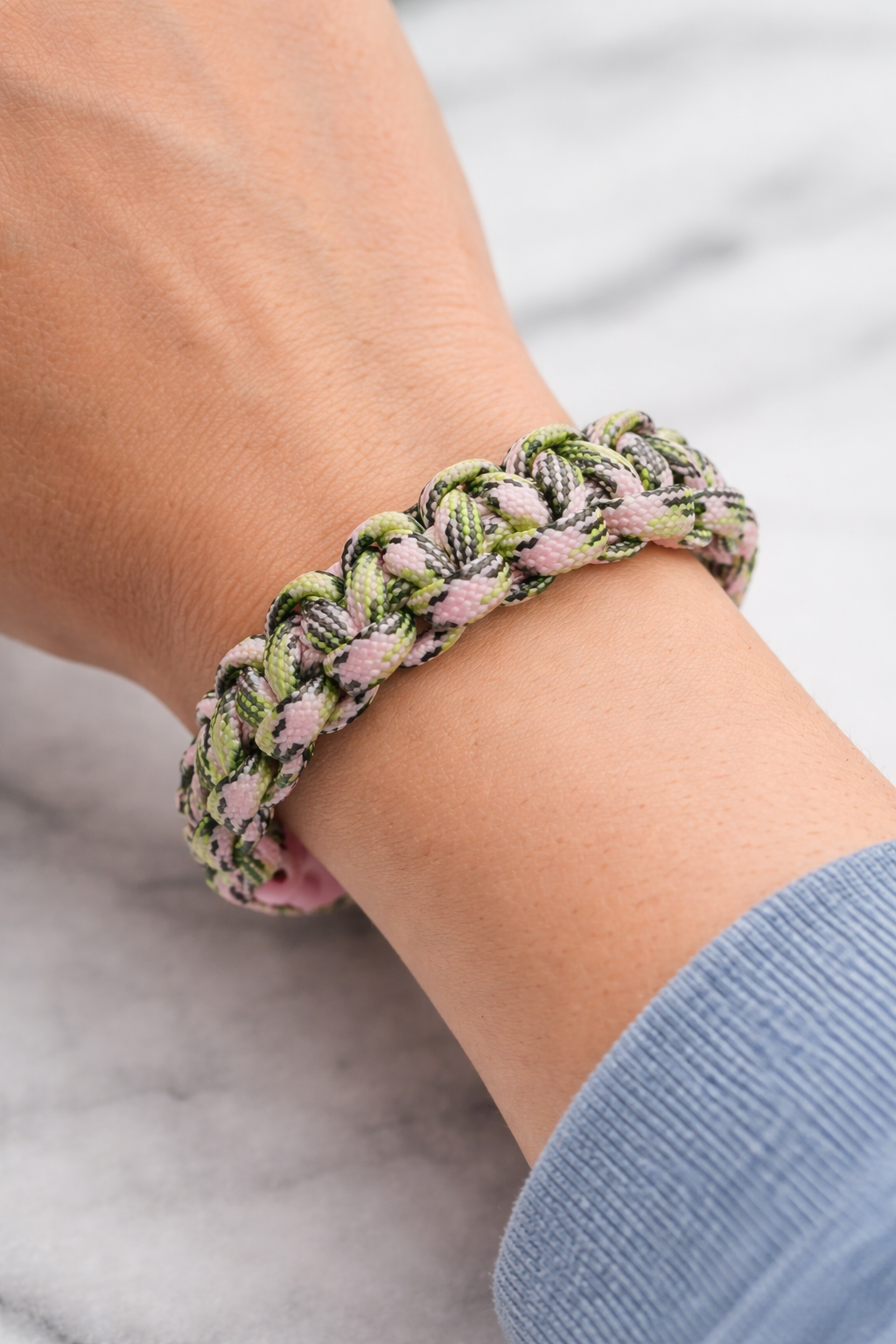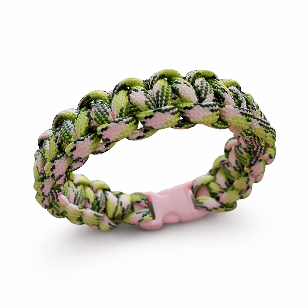 Handgjort paracordarmband med rosa spänne och flätning i rosa, grön och svart mix. Slitstarkt, bekvämt och med en unik färgkombination som sticker ut.