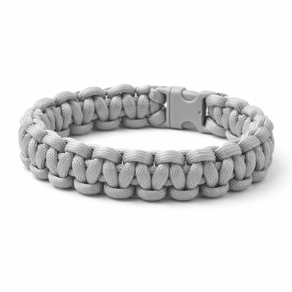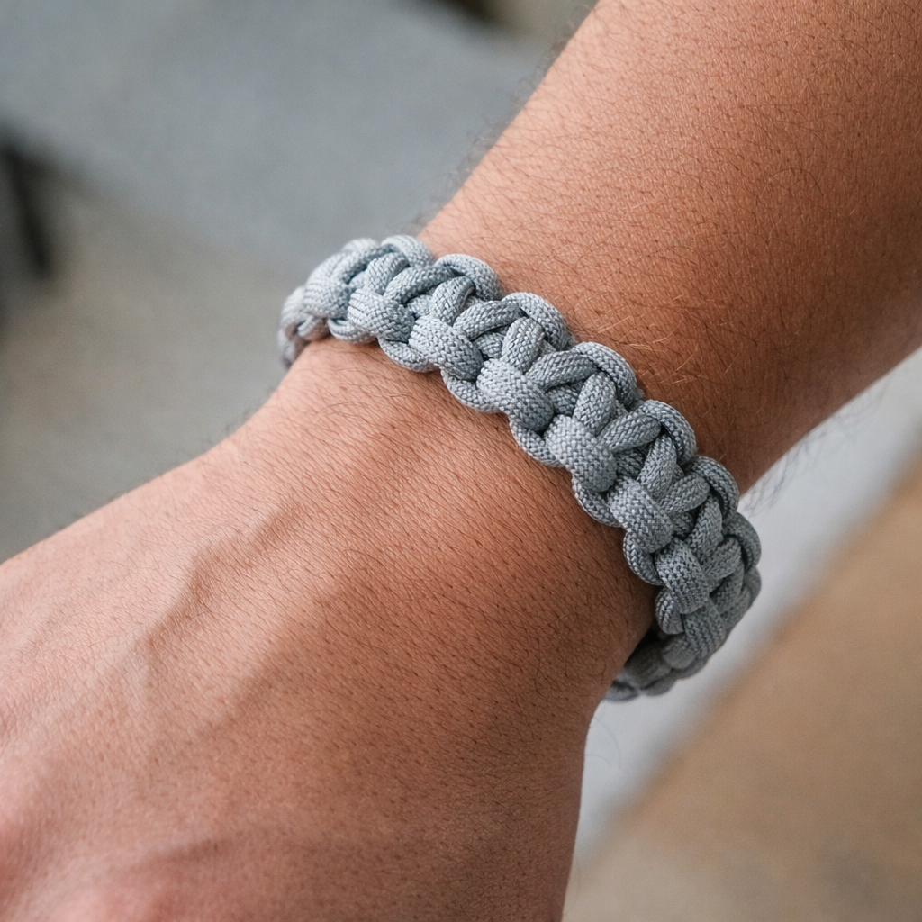 Handgjort paracordarmband i grå ton som symboliserar lugn och balans.