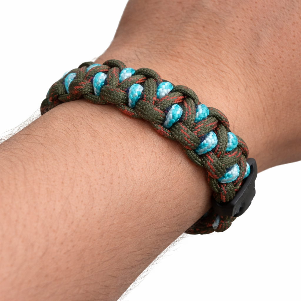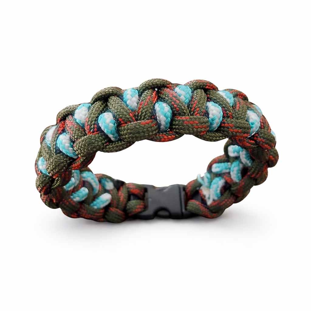 Ett handgjort paracordarmband med klassisk cobra-flätning i en unik färgkombination av grönt, turkost och rött. Armbandet är både slitstarkt och stilrent, perfekt för vardagsbruk, friluftsliv eller som en personlig accessoar.