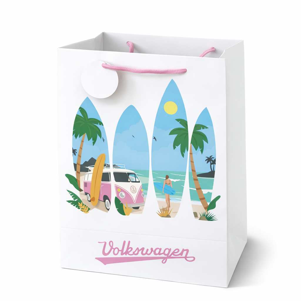 Modern och somrig present påse med Volkswagen surf design. Motivet med surfbrädor, strand, hav och klassisk VW-buss ger en avslappnad och trendig känsla – perfekt för presenter med sommar tema.