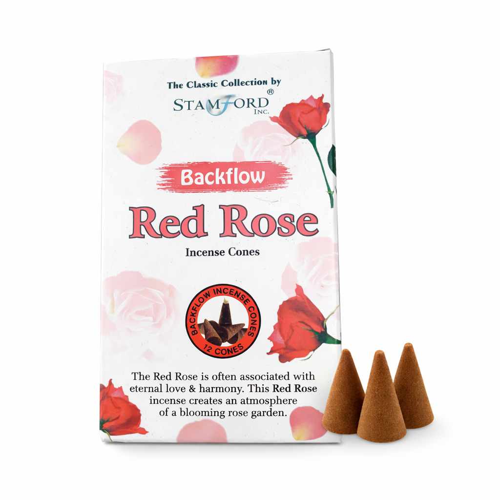 Stamford Red Rose backflow rökelse koner sprider en mjuk och blommig rosdoft som skapar en varm och harmonisk känsla i rummet. Perfekt för avkoppling och lugna stunder.