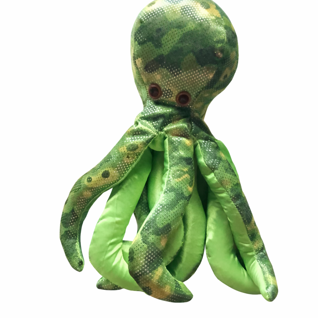 En dekorativ sandfylld bläckfisk med kamouflage mönster i gröna nyanser. Den är fylld med sand vilket ger den en tyngd som gör att den ligger stabilt på bord, hyllor eller andra ytor. Kroppen är fastare tack vare sand fyllningen, medan huvuddelen är något mjukare i konstruktionen.