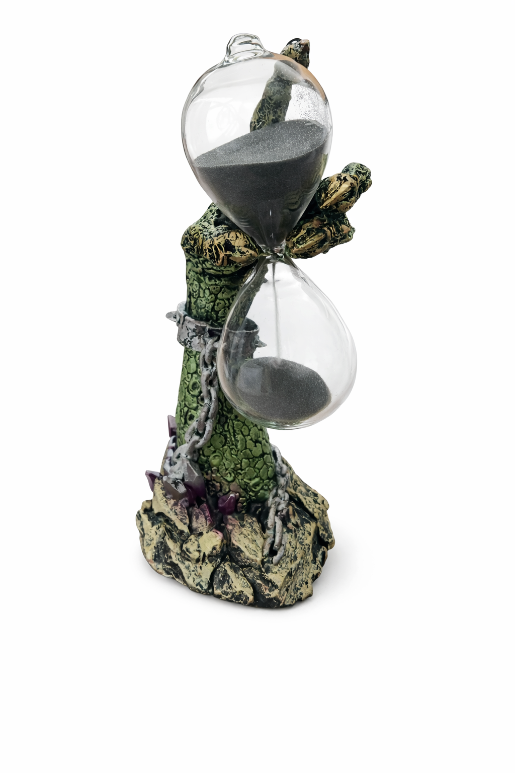 Själva stommen är tillverkad i resin med noggrant utformade detaljer, medan timglaset är gjort i glas och enkelt kan tas loss. För att starta om tiden vänder du på glaset och placerar tillbaka det i handen.